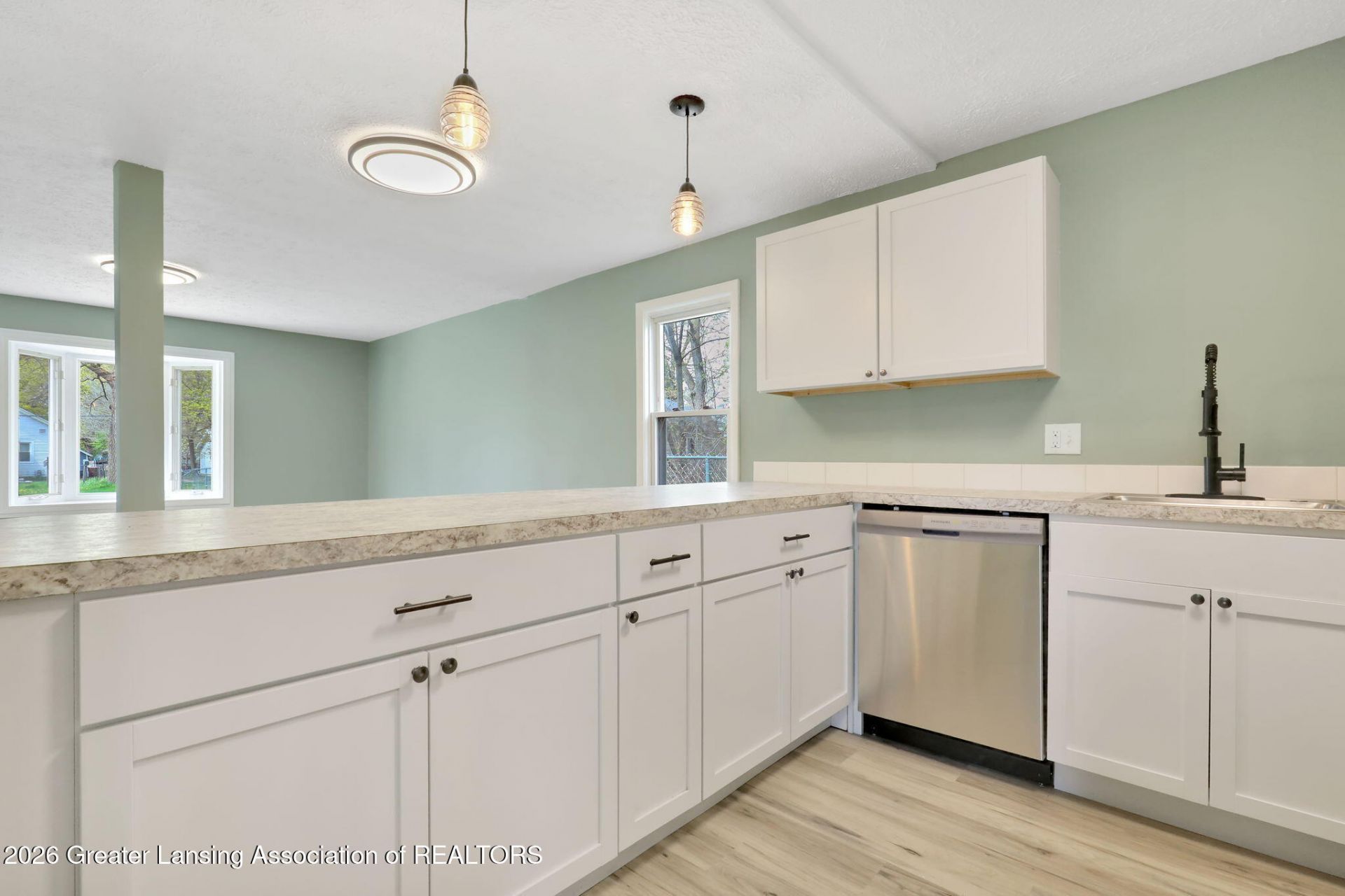 This beautifully updated 3-bedroom home on Lansings north side is completely move-in ready and designed for easy, main-floor living. The open floor plan creates a welcoming feel, centered around a brand-new kitchen featuring stylish cabinetry, updated countertops, and stainless steel appliances. A spacious peninsula extends into the living area, offering the perfect spot for barstool seating and casual dining. Freshly painted throughout, the home showcases new vinyl flooring across much of the interior, giving it a clean, modern look. All three main-level bedrooms offer generous closet space, providing comfort and functionality. Additional highlights include a full bathroom, convenient washer and dryer hookups near the entry, vinyl windows throughout, updated lighting fixtures, and central air for year-round comfort. Situated on a massive corner lot, the property also features a large shed and a two-car garage?plenty of space for storage, hobbies, or outdoor enjoyment. Homes like this dont come along often?schedule your showing today!