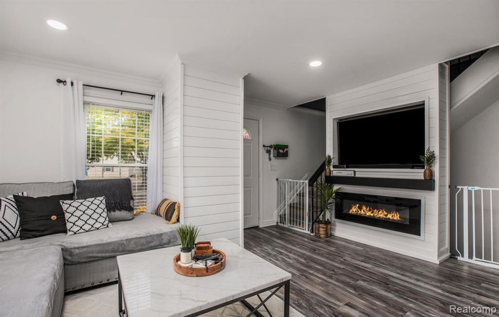 Beautifully updated corner townhouse in Clinton Township offering over 1,300 sq ft of finished living space. The bright main level features neutral tones, a stylish shiplap accent wall with an electric fireplace and TV space, and plenty of natural light. The updated kitchen has granite countertops. Upstairs offers two spacious bedrooms, a fully renovated bathroom with a stand-up shower, and convenient laundry. The finished basement adds great extra space and a half bath—perfect for entertaining or relaxing. Includes a detached garage and additional parking space in front, plus guest parking. Walking distance to parks, the library, and Fern Hill Golf Course.